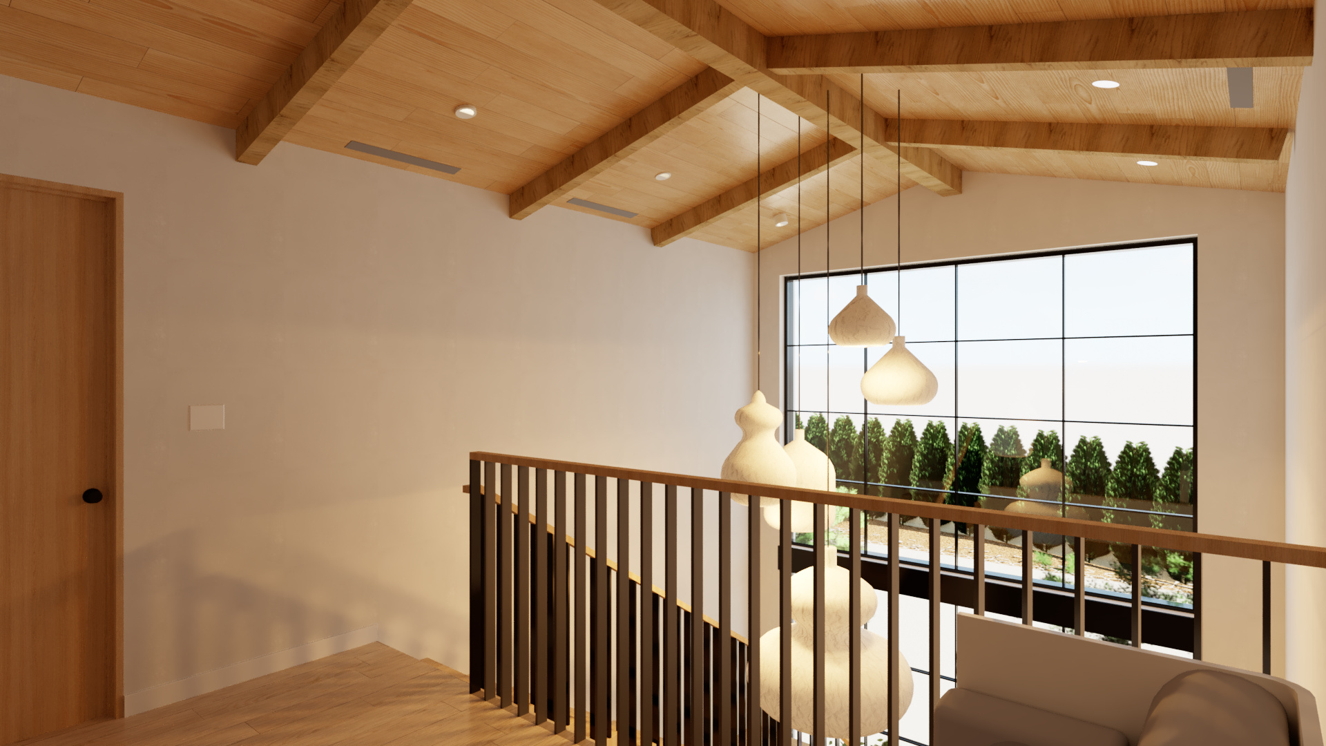 Perched along the Mulholland Scenic Corridor, the Corda Lane Residence reimagines a once-compact home into a layered, modern farmhouse retreat for a growing family. The nearly doubled footprint unfolds as a series of connected volumes, anchored by a striking double-height library hall where a floating steel staircase rises against an industrial metal window—an unexpectedly sculptural moment at the center of the plan.
