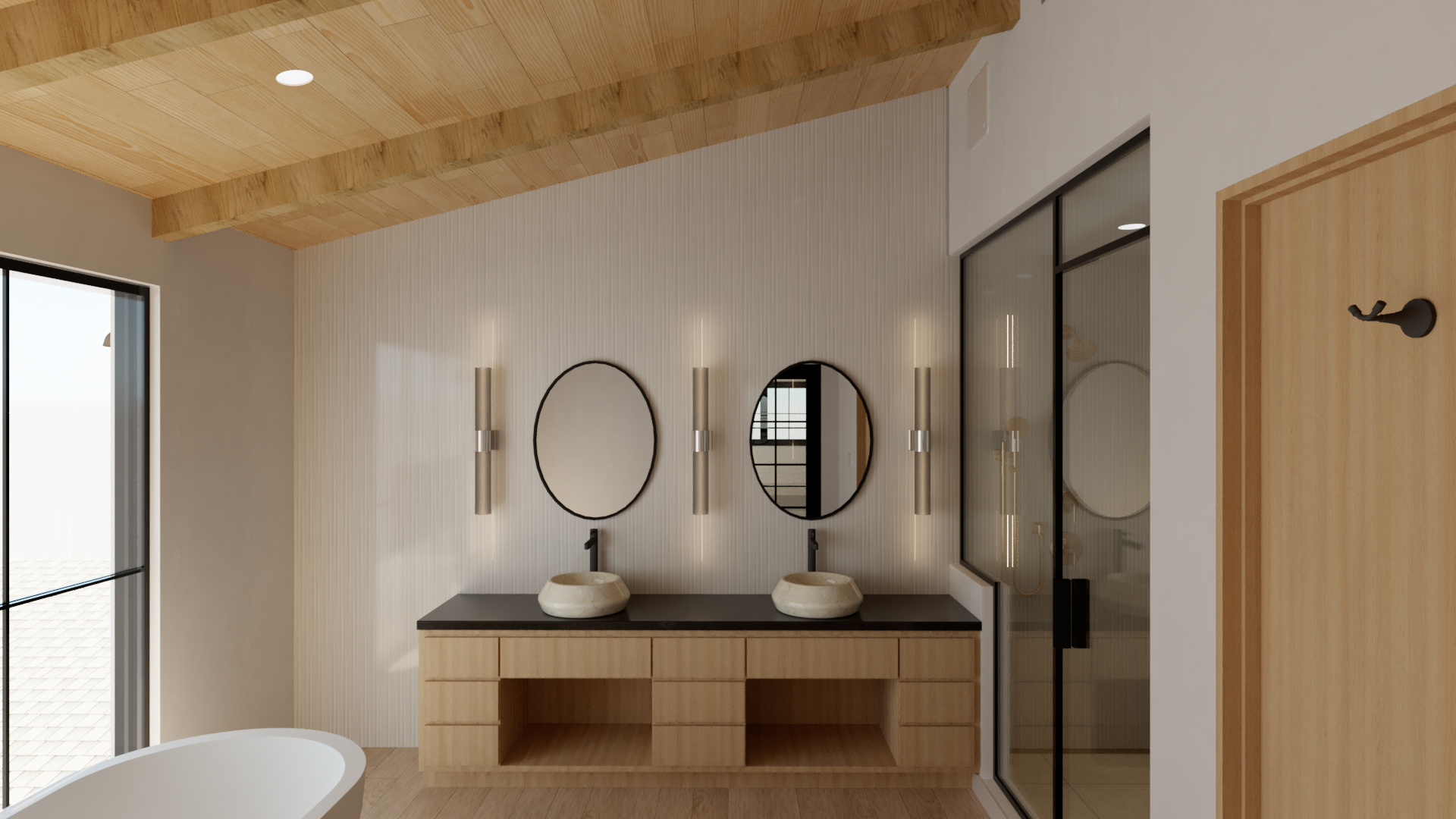 A moody blue-black board-and-batten exterior sets the tone, a deliberate departure from the white farmhouses that dominate the neighborhood. Inside, the palette softens: white oak floors and cabinetry, warm whites, and organic modern textures infuse the home with a Scandinavian calm. The result is a residence that balances rustic familiarity with tailored modernity—crafted for light, connection, and the slow rhythm of family living in the canyon.