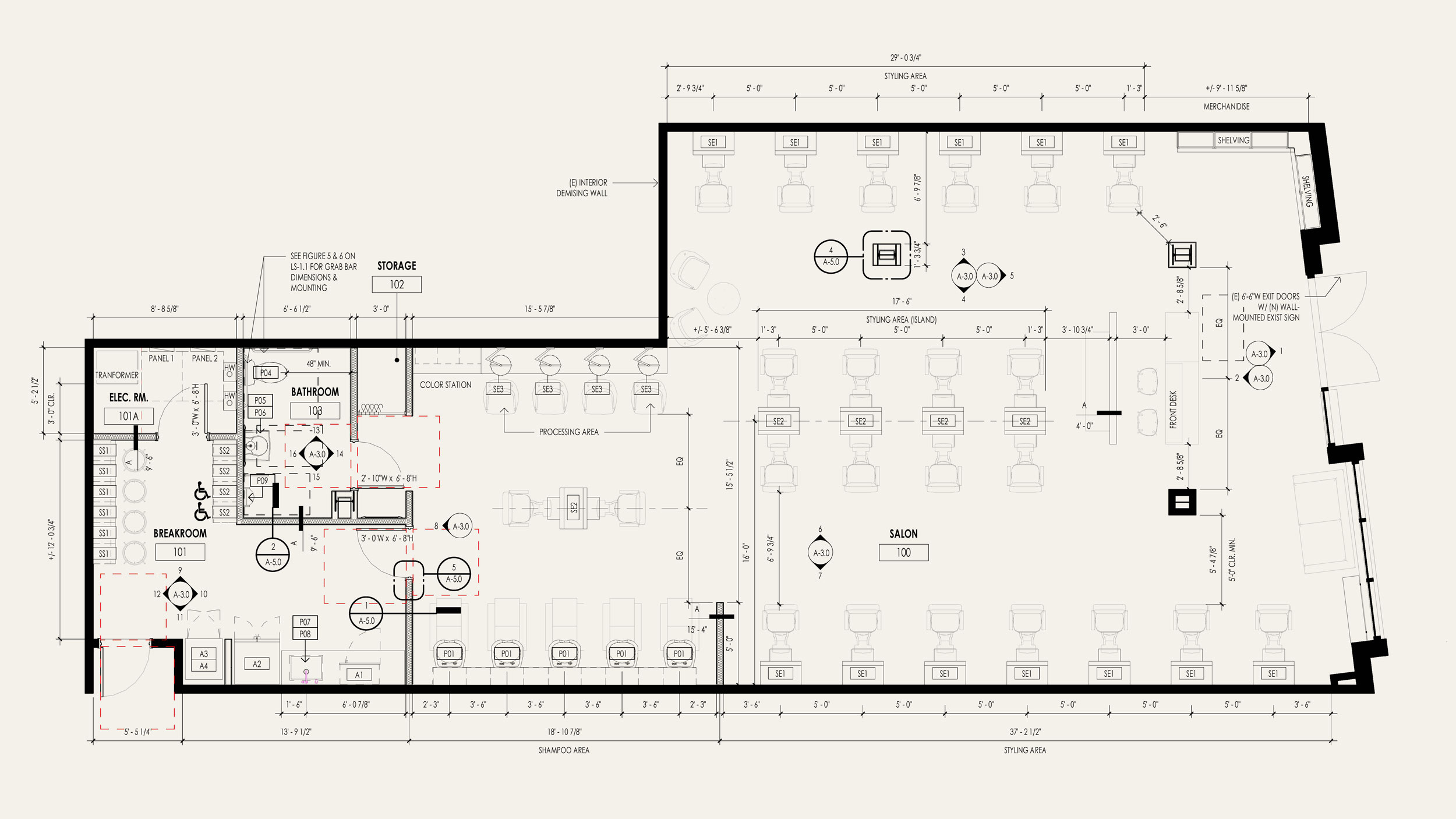The layout was carefully planned to balance styling stations, circulation, and client experience within a compact footprint. Accessibility upgrades were integral to the project, including ramping an uneven floor plate to provide compliant access to the employee lounge and the addition of a new accessible restroom.