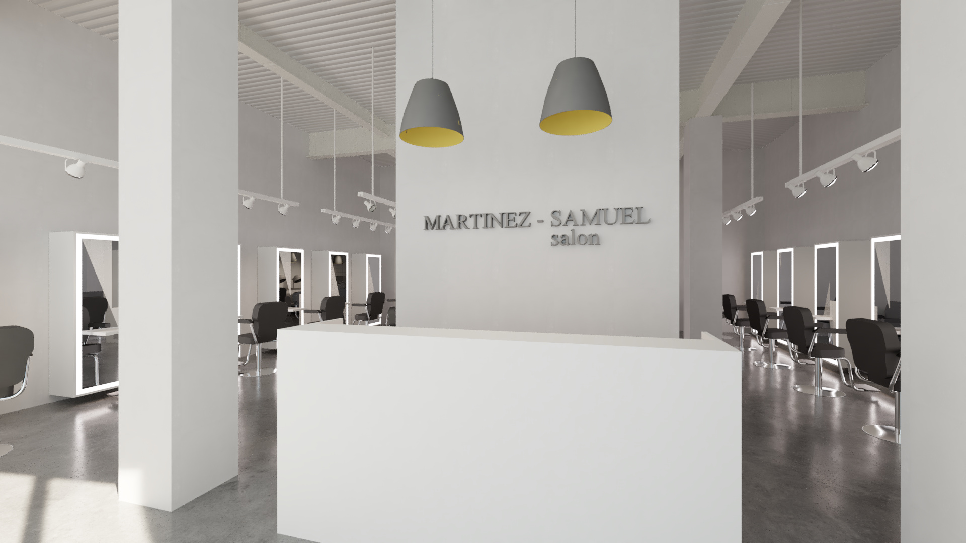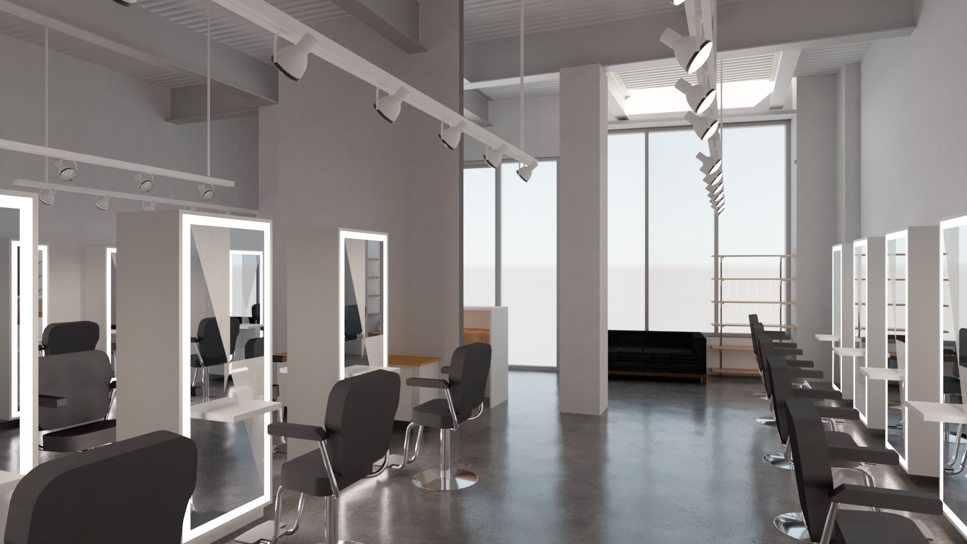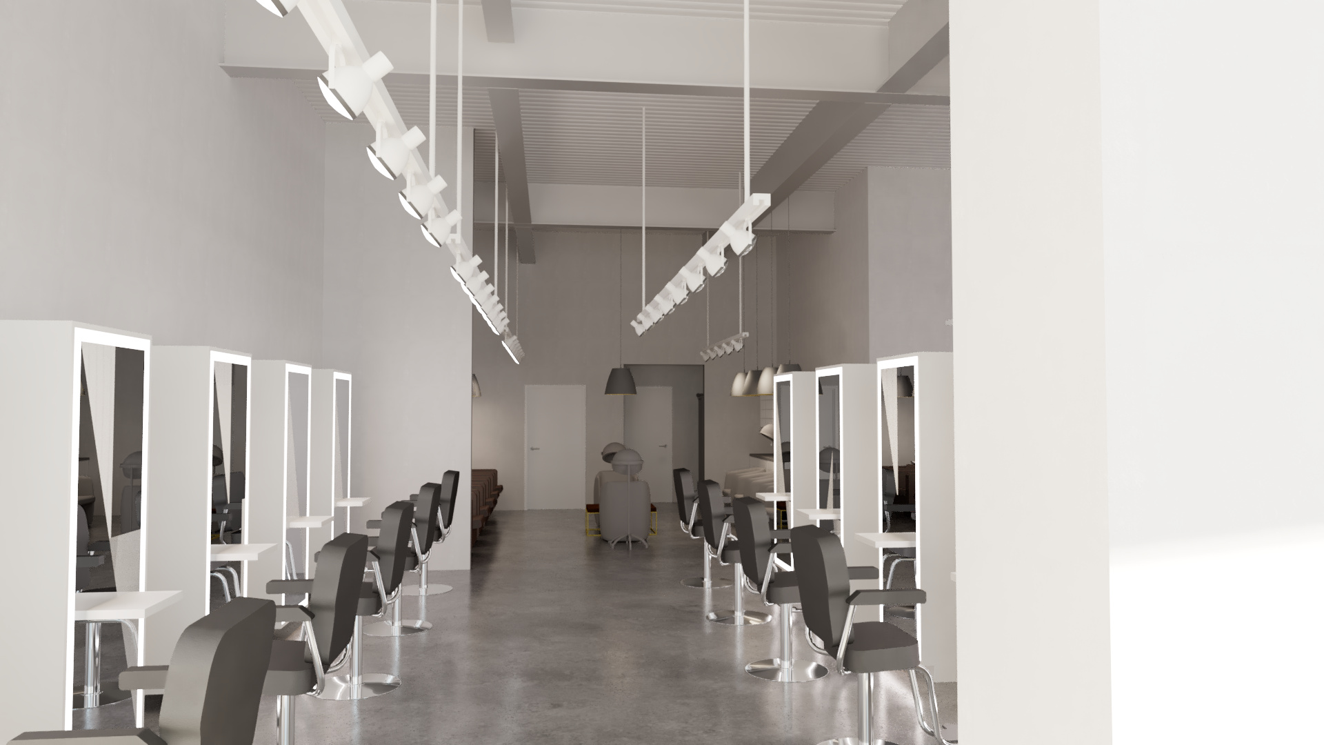 Tenant improvement of an existing commercial storefront into a refined, high-end hair salon. The design transforms a raw shell into a bright, gallery-like interior defined by polished concrete floors, smooth white walls, and vaulted industrial ceilings painted out to visually recede and enhance natural light.