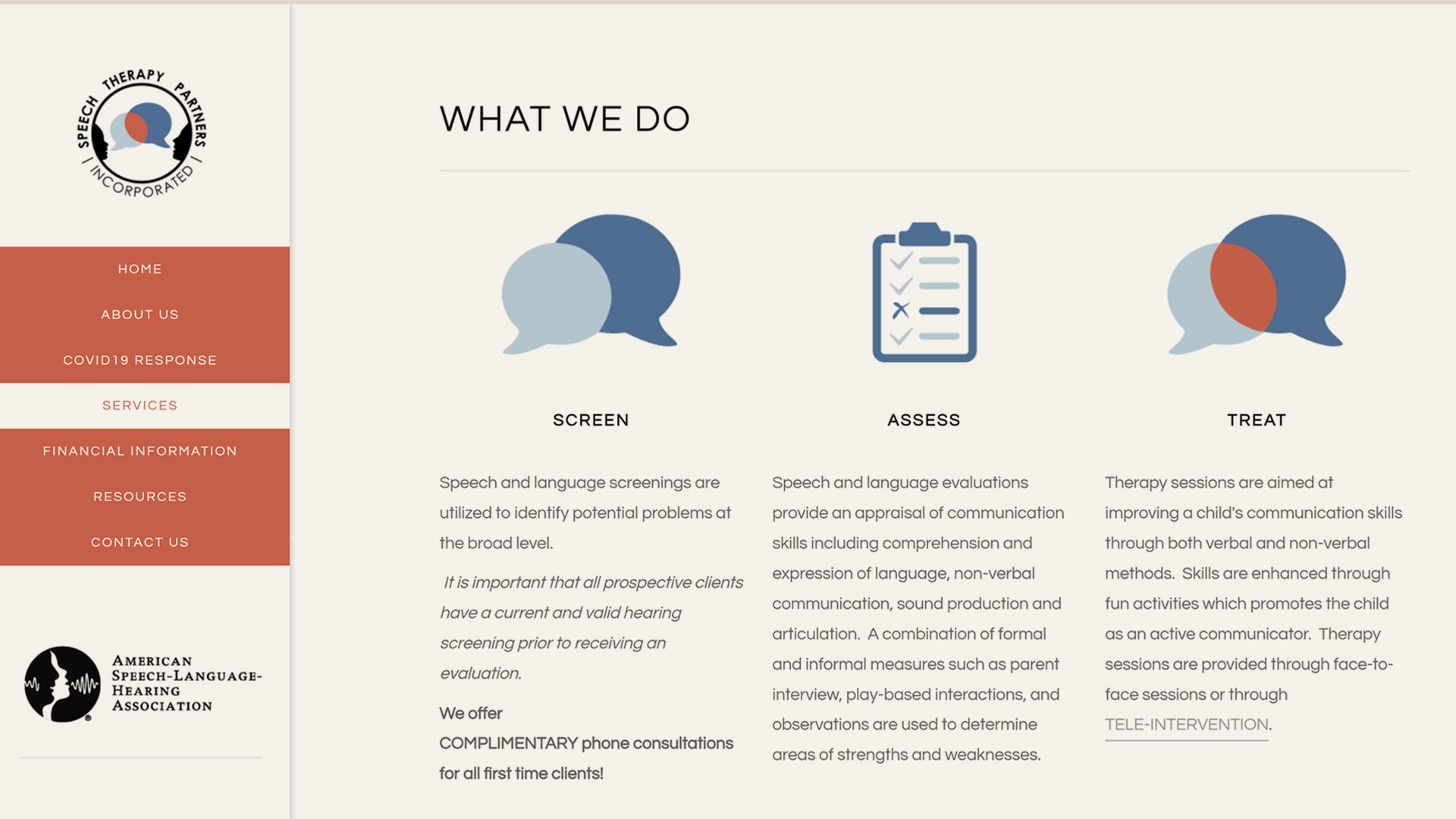 Complete brand identity and website design for a pediatric speech therapy practice serving children and families. The project included logo development, color system, typography selection, and the design of an information-rich digital platform.